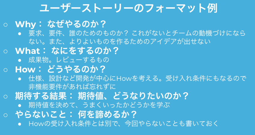 ユーザーストーリーは「<人>として、<何>をしたい。なぜなら<理由>だからだ」といったシンプルで短いフォーマットで表現されます。ただ、実際の現場ではユーザーストーリに詳細な仕様や受け入れ条件が書かれていることも多いでしょう。先述のフォーマットだけだと作れないですからね。ただ、ユーザーストーリーは短いことに意味がある点に注意するべきでしょう。