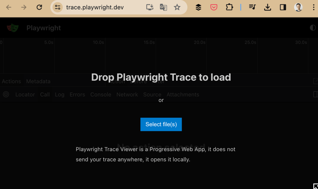 トレースしたデータは/test-resultsにZip形式で作成される。これを見るためには https://trace.playwright.dev/ へアクセスする必要がある。