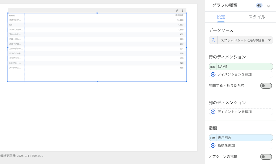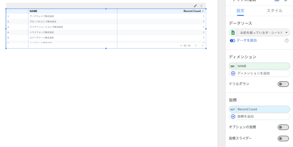 スプレッドシートをLookerの表に表示するだけなら簡単にできる(データはAIが作ったサンプル値)。
