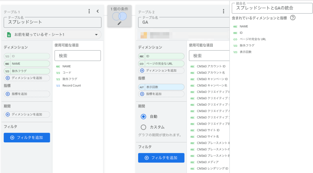 統合の状態はこんな感じ。スプレッドシート側でIDに指定していたデータと、GAにあるとあるIDを紐づけてデータ統合していた。