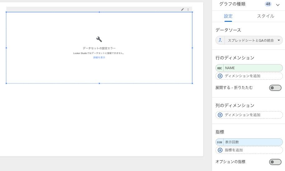 でも、スプレッドシートとGAを統合すると失敗する。エラーメッセージを見てみると、「ユーザーの設定エラー このデータソースが正しく設定されていません」と表示される。