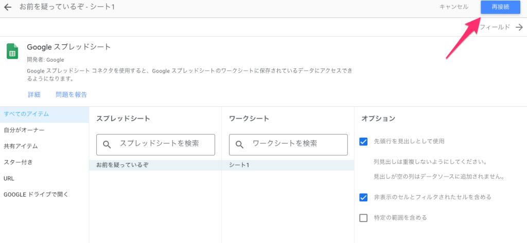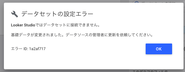 データセットの設定エラー Looker Studioではデータセットに接続できません。基礎データが変更されました。データソースの管理者に更新を依頼してください。