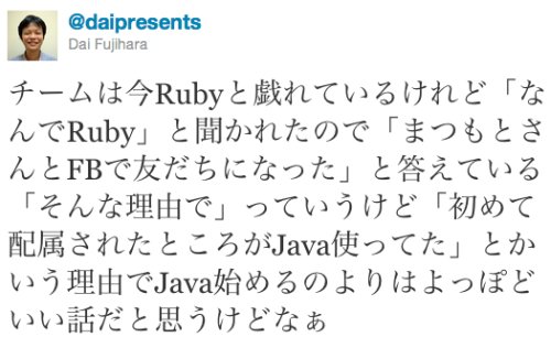 昨日、プログラム言語についてつぶやいたら、いろいろFBを頂きました。ありがとうございます。つぶやきのきっかけは… 続きを読む: 「エンジニアを確保しやすい」という理由でプログラム言語を選んでいいのか?